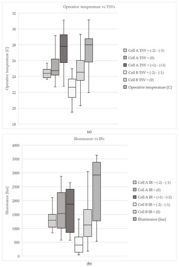 Figure 2a,b shows box plots of the occupants’ reported Thermal Sensation Values (TSVs) and Illuminance Ratings (IRs) against measured operative temperature and desk illuminance, respectively. The horizontal line in the box plot represents the median (most recurring) value of operative temperature and illuminance, respectively. The lower and the upper horizontal lines delimiting the box represent the 1st and the 3rd quartiles, respectively. Minimum and maximum values are given by the lower and upper horizontal brackets, respectively. As shown in Figure 2a, for the whole scale of given TSVs, the occupants of Cell A reported a narrower range of median operative temperature than that reported by the occupants of Cell B. The median operative temperature measured in Cell A varies between 24.4 and 27.8 °C, whereas these vary between 22.6 and 28.0 °C. It is interesting to note that when the operative temperature was close to 24.5 °C, the occupants of Cell A reported either cold sensations (TSVs = (−1)–(−2)) or neutrality (TSV = (0)). Similarly, they reported either neutrality or warm sensations when the operative temperature was close to 26 °C. This pattern was recorded for the occupants of Cell B to a smaller extent, as shown by the overlapping of the box plots at 23.5 and 26 °C. In such a perspective, the occupant in Cell A disagreed on the temperature range corresponding to neutrality by a larger extent than the occupants of Cell B. By following this logic, it may be inferred that the range of operative temperature for which the occupants clearly expressed neutrality can be defined within the upper quartile of the lower TSV (TSV = (−1) and below) and the lower quartile of the upper TSV (TSV = (+1) and above). The neutral temperature is, therefore, found to be between 24.9 and 25.8 °C for Cell A, and between 23.7 and 25.8 °C in Cell B. This gives a thermal neutral zone of 0.9 °C in Cell A and 2.1 °C in Cell B. This pattern is even more pronounced in Figure 2b, where the IRs are plotted against measured desk illuminance. In Cell A, the occupants either reported acceptable illuminance rating (IR = (0)) or visual discomfort (IR = (+1)–(+2)) for substantially the same illuminance values (between 1010 and 2290 lux). In Cell B, on the other hand, the occupants clearly reported increasing IRs at increasing illuminance, and they expressed visual comfort (IR = (0)) in the range 710–1272 lux. Moreover, the median illuminance across the whole IR scale is located in a narrower range in Cell A (1300–1900 lux) than in Cell B (400–2900 lux). The results of this section can be summarised as such: