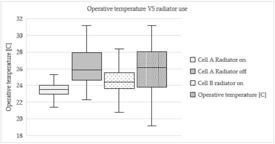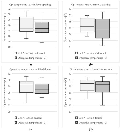 Figure 3a–d shows box plots of the occupants’ performed and desired actions in relation to the measured operative temperature in either cells. The horizontal line in the box plot represents the median value of operative temperature for the given action. The lower and the upper horizontal lines delimiting the box represent the 1st and the 3rd quartiles, respectively. Minimum and maximum values are given by the lower and upper horizontal brackets, respectively.