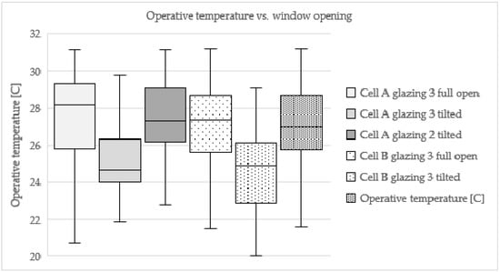 Figure 4 shows the action of opening of the windows (either full opening or tilting) and doors in both cells, recorded against measured operative temperature. It is worth noting that the door opening (employed to allow cross ventilation in the cell) was performed for 11% and 6% of the occupied time in Cell A and Cell B, respectively. Glazing 3 in Cell A was either fully opened for 25% of occupied time or tilted for 31% of the occupied time. Glazing 3 in Cell B was either fully opened for 32% of the occupied time or tilted for 23% of the occupied time. Glazing 2 was tilted automatically by the software for 49% of the occupied time in Cell A, and tilted manually by the users for 24% of the occupied time in Cell B. Therefore, glazing 3 was the most used window in both cells, as it was opened for at least 50% of the occupied time.