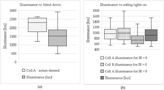 Figure 6a shows the usage pattern and the desired pattern for the window blinds against illuminance. The occupants of Cell B used the blinds between 930 and 1890 lux, whereas the occupants of Cell A expressed the desire to use the blind between 1760 and 2560 lux. The illuminance ranges are in line with the illuminance acceptability expressed by the occupants of both cells. The occupants of Cell B reported an illuminance range for IRs = (0) between 710 and 1680 lux, which almost coincides with the illuminance range of blind use (between 935 and 1885 lux). The occupants of Cell A reported an illuminance range for IRs > (0) between 854 and 2411 lux, which is much larger than the illuminance range for which they desired to use the blind (between 1767 and 2565 lux). It may be inferred therefore that the occupants of Cell A expressed a visual discomfort regardless of their expressed desire of deploying the blind. As shown in Figure 6b, the automatic operation of the ceiling lights in Cell A is to be excluded as the main factor determining visual discomfort, since the majority of votes for IR > 0 lies between 600 and 890 lux, whereas the 1st quartile of IR = (+1)–(+2) is at 855 lux (see Figure 2b). It is interesting to note that the visual comfort band for the use of ceiling lights (regardless of being automatic or manual) is similar in both cells. This may be related to the use of desk lamps by the occupants. It should be noted that also other factors than visual comfort may have determined the use of the window blind. Some of the occupants reported noise coming from the surrounding area. Given that both cells were located at the ground level and facing a public area, some occupants may have deployed the blind in response to increase privacy and reduce the incoming noise. This may explain the discrepancy between the illuminance range corresponding to visual discomfort and the wish of blind use, seen in Cell A. Discomfort due to noise was not investigated in this case study, though.