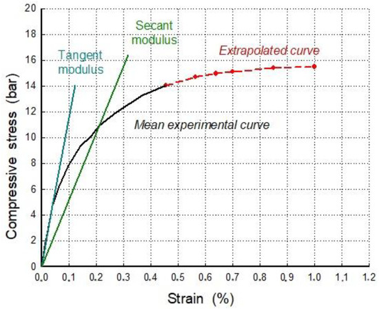 The tangent modulus is the initial slope of the stress-strain curve below a prefixed stress value (usually less than 30% of the maximum compressive stress). However, starting data of experimental stress-strain relationships could be unreliable, because of the seating effect at the initial loading phase. The chord modulus is defined as the slope of a line intersecting the stress-strain curve at two prefixed points, frequently between 5% and 30–40% of the compressive strength. The secant modulus is the slope of a line that links the origin of the stress-strain relationship with a point intersecting the stress-strain curve to a prefixed stress value (often between 40% and 75% of the maximum compressive stress).