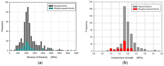 Frequency distribution of (a) the modulus of elasticity and (b) compressive strength of smoothly- and roughly-squared block masonry.