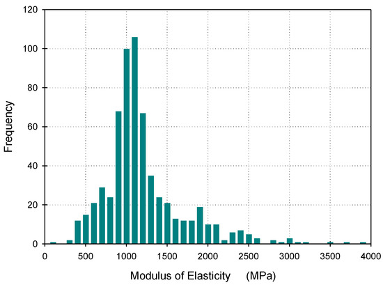 Frequency distribution of the modulus of elasticity for the entire experimental dataset.