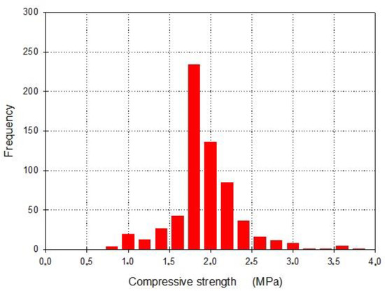 Figure 8 shows the frequency distribution of the compressive strength fm computed for the entire set of 635 flat-jack tests. The mean value was equal to 1.96 MPa, while the standard deviation and the coefficient of variation were equal to 0.42 MPa and 21.71%, respectively. The standard error of the mean was equal to 0.0169 MPa, and the confidence interval identified the range of 1.930–1.996 MPa (computed for a confidence level of 95% and assuming Student’s t-distribution).