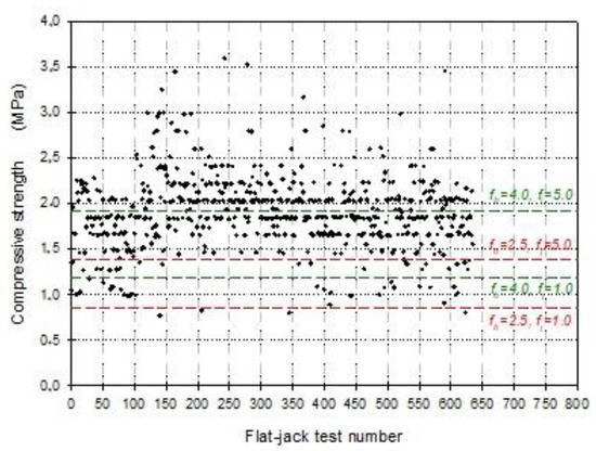 Figure 9 contains all the compressive strengths provided by the double flat-jack tests and some thresholds determined by varying the strength of tuff blocks and pozzolanic mortar within a probable and wide range. The compressive strength of tuff blocks was varied between 2.5 and 4 MPa, while that of pozzolanic mortar between 1.0 and 5.0 MPa; the latter value was also quite higher than the strengths usually measured in situ. Nevertheless, Figure 9 shows that even assuming the highest values for fb and fj, the masonry strength fm computed by Equation (2), as provided by Eurocode 6 [37] and NTC 2018 [19], did not envelop all the experimental data.