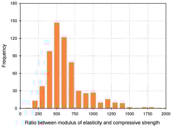Frequency distribution of the ratio between the modulus of elasticity and compressive strength.