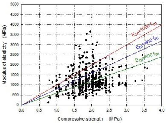 A great variation characterized the coefficients a and b in available research works since the coefficient a ranged between 400 and 2500 and the coefficient b between 0.5 and 1.0 [60,61,62]. This was also because different types of elastic moduli were computed (tangent modulus, chord modulus, secant modulus), as reported above.