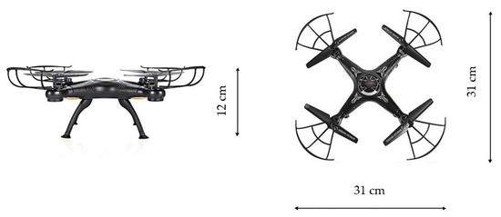 For this work the authors adopted a four-propeller radio-controlled drone. The hull of the UAV was made of high-quality acrylonitrile-butadiene-styrene (ABS), while the radio control used a frequency of 2.4 GHz. The balance during the flight of the UAV was guaranteed by a 6-axis gyroscope that ensures its stability with a weight of 2.1 kg. Each quadcopter propeller had two blades, while the four propellers rotate alternately: two propellers rotate counterclockwise and the other two clockwise. Figure 1 shows the dimensions of the UAV as well as showing how the four propellers of the UAV are arranged.