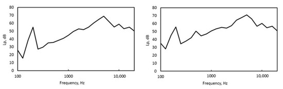 In the absence of anthropic noise configuration, Figure 4 shows the values of the minimum and average spectrum emitted by the UAV in the environment under test in the frequency domain of a one-third octave band. The receiver–noise source distances are respectively (A equals 5 m), (B equals 10 m), and (C equals 15 m). It is possible to note the tonal component presence at the frequency of 5000 Hz.