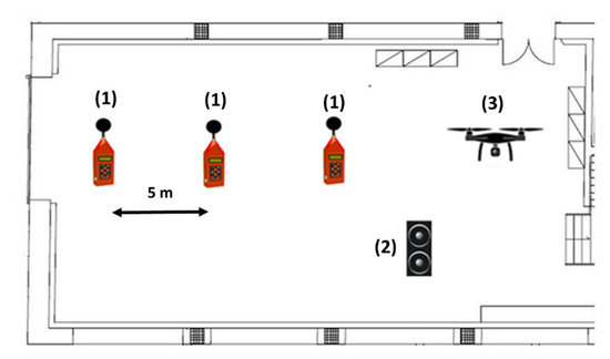 Plan of the internal simulation environment. The positions of the elements used in the simulation scenarios are clearly indicated: sound level meter (1), loudspeaker (2), and UAV (3).