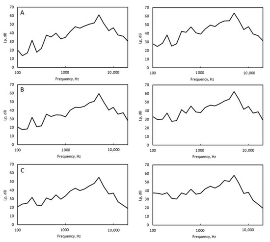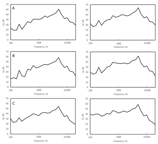 Values of the minimum (at the left) and average (at the right) spectrum emitted in the position of the UAV in the environment under test, with anthropic noise (voice). The receiver–source distances are respectively: ((A) equals 5 m, (B) equals 10 m, and (C) equals 15 m).