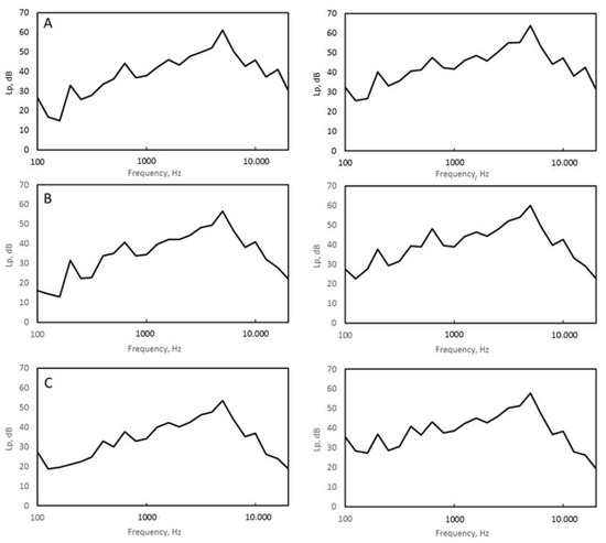 Values of the minimum (at the left) and average (at the right) spectrum emitted in the position of the UAV in the environment under test, with anthropic noise (music). The receiver–source distances are respectively: ((A) equals 5 m, (B) equals 10 m, and (C) equals 15 m).