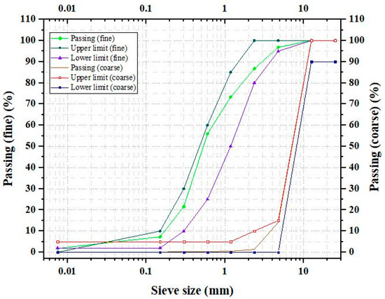 GPC was produced with sand and coarse aggregates (with a maximum size of aggregates 12.5 mm) from a quarry in British Columbia, Canada with a relative dry density of 2.67 and 2.71, respectively. The water absorption ratio of sand and coarse aggregates was 0.79% and 0.69%, respectively, in accordance with ASTM C127 [41]. The particle size distribution of coarse and fine aggregates was measured (shown in Figure 2) in accordance with ASTM C33 [42]. Fineness moduli of the coarse and fine aggregates were measured as 6.85 and 3.54, respectively.