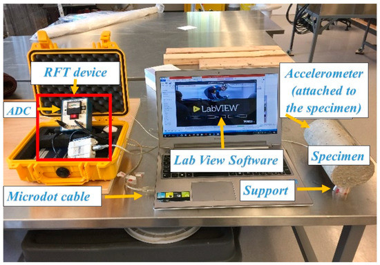 The RFT device includes a PCB Integrated Circuit Piezoelectric (ICP) accelerometer (with a pickup sensitivity of 102.2 mV/g (10.2 mV/ms-2) and frequency range of 0.3–15 kHz) that is attached to the concrete sample surface using adhesive wax and a 4 channel NI USB6009 DAQ Analog Digital Converter (ADC) is used for collecting the input compression wave voltage. A standard ball tip hammer weighing 110 ± 2 g with a tip diameter of 10 mm is used to strike the sample surface. A total of 72 readings on 24 samples were taken and outlier were omitted in the average values. National Instrument’s LabVIEW 2014 (NI LabVIEW) was used to acquire and analyze the data. The program was developed for this study considering ASTM C215 [48] for acquisition requirements. Table 5 indicates the properties of the accelerometer used in this study.
