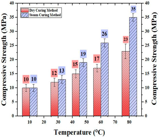 Accelerated curing is any method by which high early age strength is achieved in GPC. In this paper, dry and steam curing methods were used to achieve higher compressive strength. Hence, for the dry curing method, GPC specimens were kept in an oven at temperatures of 30 °C, 45 °C, 60 °C, and 80 °C for a period of 24 h and kept at ambient temperature for 28 days. For the steam curing method, samples were kept in a bucket surrounded by water. The bucket was wrapped up tightly to prevent excessive evaporation during the curing process and the bucket was then kept into an oven at temperatures of 30 °C, 45 °C, 60 °C, and 80 °C. Lastly, samples were removed from the oven after 24 h, unwrapped and kept at ambient temperature for 28 days. It is well established that a higher temperature for a longer period of time (up to 72 h) can result in higher strength gain in GPC [37,38]. However, the aim of this study was to expose the specimens to heat curing only for 1 day to reduce the amount of energy utilized for curing. Another goal was to determine the feasibility of using curing temperatures lower than those reported in the literature [46].