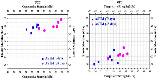 Equation (1) was used to calculate the elastic modulus of GPC and PCC samples at an age of seven days and 28 days. Then, a correlation between compressive strength and modulus of elasticity was derived (Figure 6). It can be seen in Figure 6 that a slight overall increase in compressive strength of PCC resulted in a much larger increase in the overall value of dynamic modulus of elasticity approximately ranging from 27 GPa to 33 GPa. However, GPC showed a minor increase of the dynamic modulus of elasticity, approximately ranging from 20 GPa to 24 GPa, with an increasing of compressive strength from 30 MPa to 35 MPa. The standard deviation value of GPC and PCC was 1.24 and 0.76, respectively, at seven days, while the standard deviation value of GPC and PCC was 0.85 and 0.96, respectively, at 28 days. This is a very interesting finding and is in good agreement with Fernandez-Jimenez et al.’s study [87] where with a similar compressive strength the elastic modulus of fly-ash based GPC was in the range of 10–20 GPa, while cement-based concrete had a higher elastic modulus in the range of 25–35 GPa. According to Duxson et al. [88] and Sofi et al. [89], the elastic modulus of GPC depended on the SiO2/Al2O3 ratio, mix proportion and curing method. However, both Sofi et al. [89] and Duxson et al. [88] reported that the elastic modulus of GPC varied from 10–55 GPa, which covers the values of elastic modulus of GPC reported in this research. The aforementioned issue indicates that Equation (1) is applicable for cement-based concrete, and this equation overestimated the dynamic elastic modulus of GPC owing to the higher resonant of PCC [25].