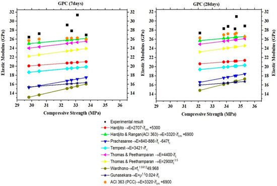 Tempest et al. [54] proposed Equation (4) to calculate the elastic modulus of fly-ash based GPC. The modulus of elasticity of samples was evaluated using the procedure given in ASTM C469 [55]. The results showed that the elastic modulus increases as the compressive strength of GPC increases. It was also found that experimental values have the same trend (slightly higher) as the proposed formula.
