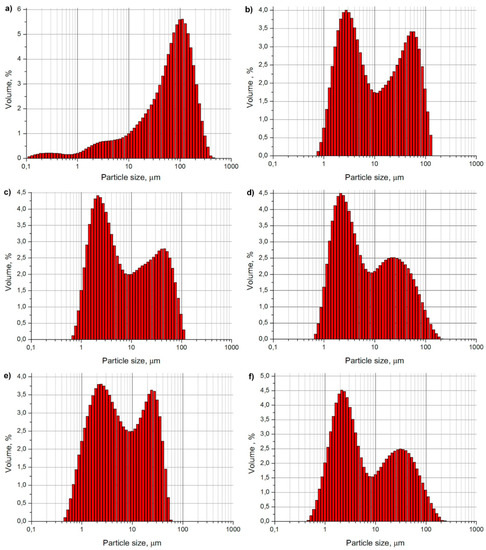 Commonly used parameters, calculated automatically by the Mastersizer 3000 laser diffraction particle size analyzer software, were used to describe the granulometry results. The mean diameters D [4; 3] and D [3; 2] are defined by Equations (1) and (2):