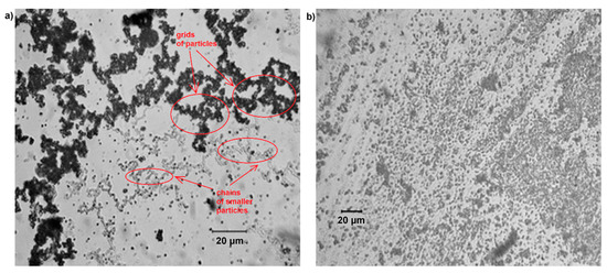In the study of calcium hydroxide suspension in an optical microscope (Figure 2), it is seen that Ca(OH)2 particles with sizes of 2–4 microns as a result of Van der Waals forces are connected by dipoles, forming a spatial grid. Smaller particles form chains of complex configuration. After vibro-treatment, their size decreases by 2.0–3.5 times, and at the same time, there is a complete destruction of the structure and alignment of the particle size.