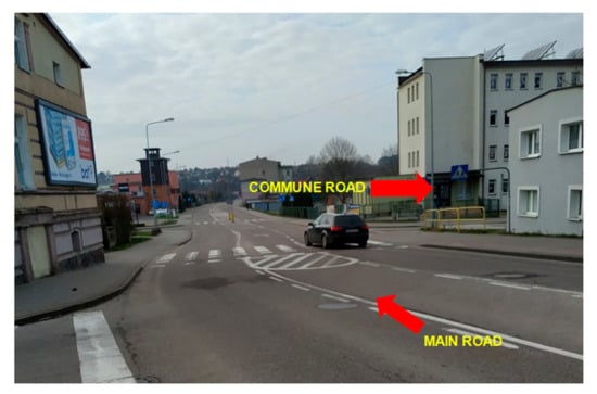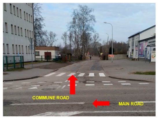 In its present condition, the existing main road is connected by a collision junction with a subordinate-commune road (see Figure 2 and Figure 3). The condition of asphalt pavement on the section of the main road covered by the study, the authors assessed (based on the local inspection) as quite good.