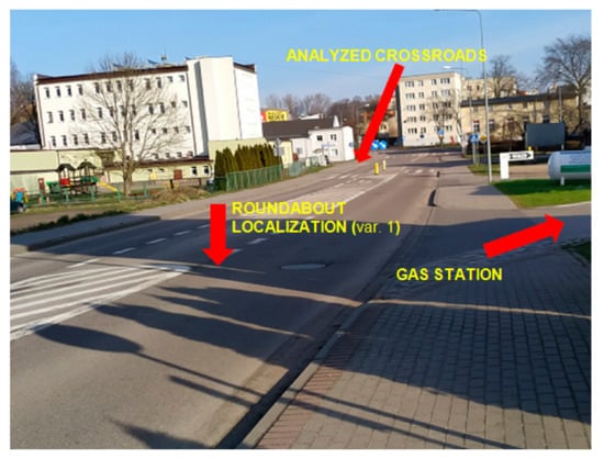 Each of the proposed variants of reconstruction of the intersection generates a specific cost and time of implementation. They are closely related to the scope of planned construction works. At the stage of making the investment decision, i.e., choosing the optimal variant, one should also consider other criteria, important primarily from the point of view of the safety of road participants. When making a decision regarding the choice of a particular investment implementation option, the contracting authority is also obliged to take into account the growing demand for road transport, the ever-increasing requirements of users regarding the quality of travel, an increase in the number of vehicles traveling on the roads, successively increasing traffic volume and sensitivity of road systems to interference and fast infrastructure degradation. An important parameter of choosing the optimal solution should also be the element of transport impact on the environment. This means that the subject of interest should be such a variant, the implementation of which gives a chance to reduce the adverse impact of the investment on the natural environment [], i.e., it will reduce air pollution and noise emissions in the project impact zone.