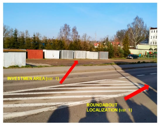 - construction of a new roundabout on a main road at 30 m from the original intersection, partly on private and investor-owned land (option I)—see Figure 5;
