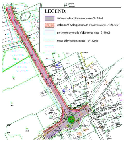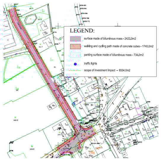 Within the planned investment there are downtown buildings-numerous residential and service buildings, a kindergarten, a gas station, and small shops. On both sides of the main road there are pedestrian and bicycle paths, followed by concrete pavement walkways (Figure 4).