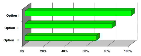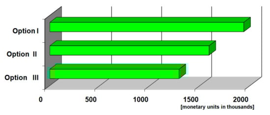 The cost of performing the scope of work covered by option 2 represents 82% of the cost that should be incurred when deciding to implement option 1. The cost of carrying out work according to option 3 represents almost 67% of the cost of performing the scope of work provided for in option 1 (Figure 11).