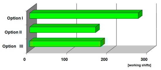 The time related to the implementation of the works covered by option 1 is the longest—272 working shifts (Figure 12). This is primarily due to the largest range of activities to be carried out.
