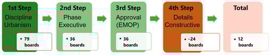 The case study example of this study consisted of the boards of the PAC2 executive project in Morro do Encontro, a project still in the executive design phase, available in the digital medium, from a project developed by a bidding consortium, and managed and supervised by the Public Works Company of the State of Rio de Janeiro (EMOP) []. The project boards comprised of technical drawings, detailed with dimensions, situation plan, an indication of the north, legend of materials, urban furniture, colors, outlines, and coordinates. The boards were developed in A1 format, in printed and digital media, with floor plans and cuts, with variable scales, being 1/1000, 1/500, 1/250, and 1/100. The sample selection was divided in four steps. The first step was to collect the set of Urbanism PAC2 projects, of Morro do Encontro. It is consisted of 79 boards. The second step was to select the ones in the executive design phase, making up a total of 36 boards. The third step was determined to include those that had already been approved by EMOP, totaling 36 boards. The fourth step excluded those whose drawings were of constructive detail. In this way, the final sample resulted in 12 boards. Each of the steps in this process are represented according to Figure 3.