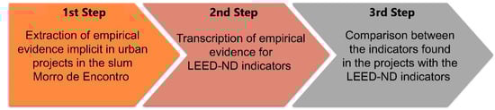 Data collection was carried out in three main steps as highlighted in Figure 4. The first step of data collection consisted of the electronic extraction in full of the project present in the archives of the EMOP of the State of Rio de Janeiro. The Manual used for this analysis was LEED v4 for Neighborhood Development in its updated English version of April 5, 2016 []. The data was stored in an Excel for Windows spreadsheet with the following data found on each of the boards: name of the drawing; revision number; date; format; scale; unit of measurement; the presence of captions, presence of details, coordinates, presence of evidence, and general observations.