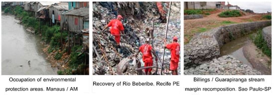 The Growth Acceleration Program herein represents an initiative to produce sustainability applied through public policy. It consists of a Brazilian government program that, in dialogue with the private sphere, sought to balance the economy of the country by accelerating and sustaining growth. At the same time, it aims to reduce poverty and social inequality, preserve price stability and reduce State indebtedness, besides, to generate job opportunities and income. This program was sustained in two stages, which were known by the acronyms PAC and PAC2 []. The program has a diverse area of activity such as transport, energy, water, and electricity []. Over the years, its structure has evolved, differentiating from the first to the second stage; in both stages, urbanization in precarious settlements, slums, was contemplated. Therefore, when the activities of PAC in the slum areas are defined as Priority Investment Project (PIP), the Social and Urban Infrastructure works, which are under the management of the Ministry of Cities (MCIDADES), are the implementation of integrated housing actions, and sanitation and social inclusion. Meanwhile, operationalization had been carried out by Federal Savings Bank—CEF (Caixa Econômica Federal) []. Figure 5 illustrates the areas of intervention that are always very precarious.