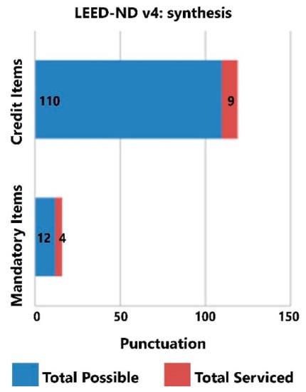 The concept of Sustainability has evolved over the years in the same way the systems of sustainability indicators have evolved. Thus, this work applies the most updated version of the LEED-ND system (LEED v4 for Neighborhood Development) []. The project must be framed in one of the subdivisions of LEED within a minimum score to receive certification []. The score can vary between 40 and 110 points, and the resulting levels can be Certified, Silver, Gold, and Platinum []. The score must be distributed according to the checklist of each typology. Each checklist is made up of thematic divisions into large groups. Finally, the groups are organized between prerequisite variable points (do not score) and credits (score differently), in which it is possible to identify an excerpt from the LEED-ND score sheet, about neighborhood development []. The LEED-ND typology has its points distributed in three main axes with items of prerequisites and credits (such as Intelligent Location and Connections, Neighborhood Design, and Green Infrastructure and Buildings), in addition to the credit items in Innovation and Design Process and Regional Credits [].