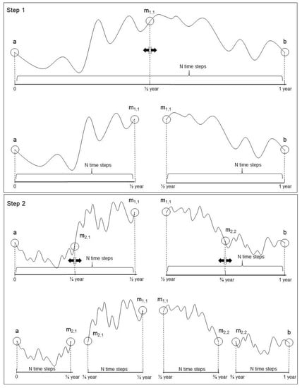The basic idea of the method is to first perform a rough optimization of the annual operation, and then gradually fine-tune the solution by re-optimizing smaller time intervals. The first step of the method is, hence, to optimize the annual operation using a relatively small number of time steps, N, (N = 26 time steps are used in the case study). Thereafter, the energy storage load at the beginning, the middle and the end of the one-year period is fixed. The one-year period is then bisected, so that the first half of the year forms one new time period and the second half of the year forms another new time period.