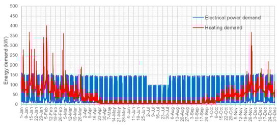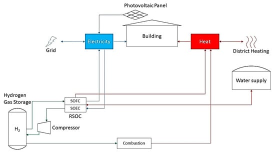 Figure 3) includes solar PV panels, an RSOCHS system, a water tank, a boiler with a hydrogen combustor for heat generation as well as connections to the electricity grid and the district heating network (for both import and export). The annual heating and electricity demand profiles of the office building are produced by IDA ICE simulations [