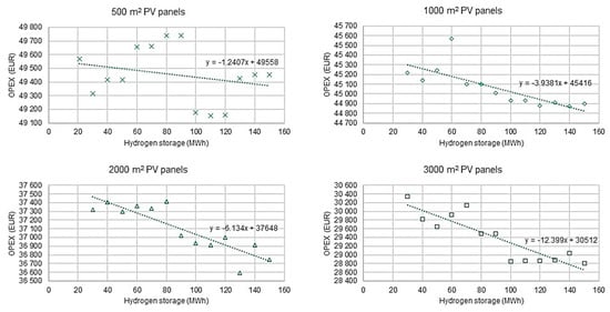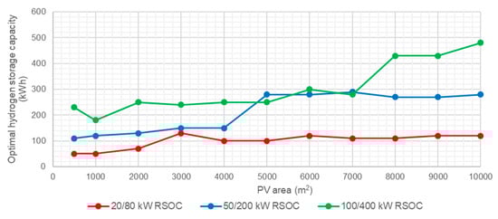 The optimal hydrogen storage size varies between 50 and 5000 kWh, depending on the RSOC size and the solar PV panel area. The optimal size of the hydrogen storage tends to increase as the RSOC size and the solar PV panel area increases.