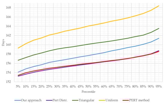 In addition, the real deadline of the project on 31 May 2019 (157 workdays) was possible by less than 40% in our approach and less than 75% in the PERT distribution, less than 10% in triangular, less than 5% in uniform, and less than 75% in the PERT method. The present finding illustrates that the manager had a wide range of different tools to correctly describe the uncertainty. Triangular and uniform distribution provided much more pessimistic results than the PERT distribution and classic method. It worth mentioning that our approach works as an intermediate option that collaborates with characteristics from each distribution used, according to the nature of the activities realized, since we try to balance the “optimism” of PERT distribution with the “Pessimism” of the triangular and uniform distributions. Moreover, the different strategies provided to the risk manager are shown in Figure 2, which describes the duration curves of each distribution for the different percentiles of this analysis, proving that triangular and uniform distributions provided, by far, a much more pessimistic output than the PERT method and distribution. Our approach works as an intermediate strategy that alerts the manager to rising delay risks but not leading to overly pessimistic estimations that may lead to implementing ineffective mitigation measures with implications for the budget.