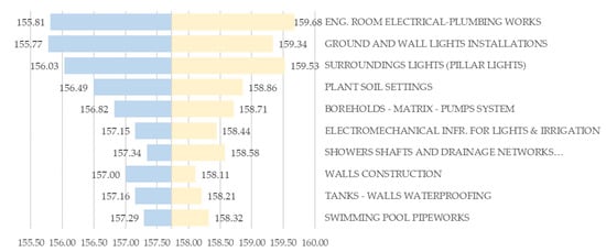 After determining the possibilities of completing the project 0n time, we performed an extended analysis of how the specific activities affect the total project duration. Figure 3 illustrates a tornado graph in which the activities are ranked according to the range of minimum-maximum project duration caused by the specific activity’s duration range. This information can support the risk manager in making decisions about which task or group of tasks to target during the implementation of mitigation measures. Note that the baseline duration was 157.72 days. An interesting conclusion derived from this figure is that the duration of the first six more important tasks was expressed by uniform distribution, while the other three belong to the “building works” category, and their duration was expressed by PERT distribution. The last activity on this list was an “electrical and mechanical installations” task, expressed by uniform distribution.