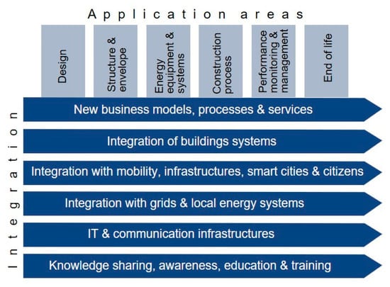 | Integration | HVAC, Light, Energy, Security, Telecommunications, Fire prevention and fighting, Vertical transportation, Hydraulic | [10,11,12,13,14,22,38,39,52,63,69] |