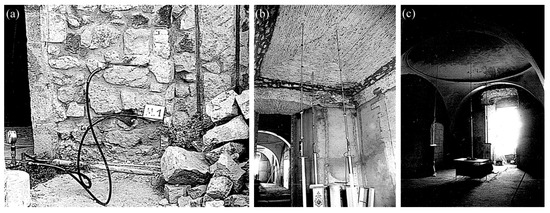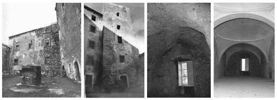 The visual inspection of the Castle of Melfi showed that the central part of the castle is in a good conservation state, thanks mainly to the restoration campaigns of the last few decades. However, the detailed investigation of the ancient and recent castle history and its historical photos (Figure 12) show that in the second half of the 1970s, the castle was in a very poor state of maintenance. When historical buildings do not undergo regular maintenance, environmental actions may deteriorate all structural components, including the roof and the walls, as indicated in [26]. It is imperative to identify the actual sources of decay and vulnerability (such as lack of maintenance, prolonged roof leakage, poor initial design, excessive loading, foundation settlement…) in order to plan appropriate interventions, that may be structural, such as wall reinforcement, or non-structural, such as roof fixing.