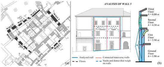 Identification of the walls analyzed by the kinematic linear analysis (a) and scheme for the identification of the forces and the structural mechanisms involved in the kinematic analysis of Wall 5 (b).