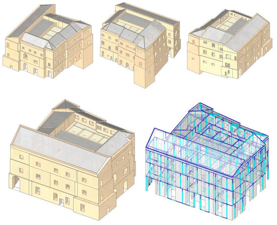 In this work, the equivalent frame model and the global analyses were performed with the Aedes PCM software [36]. The analytical model of the castle takes into account the experimental mechanical properties founded in the material survey, according to a hybrid vulnerability assessment method [37,38]. The geometric model comprises only the portion of the castle that currently hosts the museum (Figure 15). The structural model considers the floors as rigid diaphragms. The same modeling strategy and the same software were used for the seismic vulnerability assessment of other relevant monumental buildings, such as the Civic Museum of Sansepolcro (Italy) that contains an important fresco painted by Piero della Francesca [39], the Albornoz fortress, a 14th stone masonry construction located in central Italy [40], the Palace of Priors in Perugia (Italy), a medieval monumental building that currently hosts an important museum [41] and the Pompeii’s Stabian Baths where the model was used to assess the mechanical behavior of selected masonry structures damaged during 1st century seismic events [42].