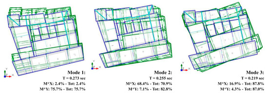 The modal analysis of the global model shows that the first three vibration modes of the structure are equal to T1 = 0.273 sec, T2 = 0.255 sec and T3 = 0.219 sec, respectively (Figure 17). The first two modes are mainly translational, while the third mode is mainly torsional.