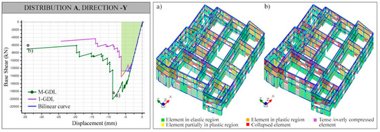 Considering all the combinations and all the seismic directions requested by the Italian and European building codes [23,24,25], the most severe loading condition is in the y-direction (-Y seismic action) for a triangular force distribution. Figure 18 shows the pushover curve for this load direction, the force distribution and the shear status of the masonry walls at the step corresponding to the (a) ULS and (b) the last step of the analysis. This result is determined by the presence of few bearing walls in the transversal direction (y-direction), and by the dead loads on floors that are mainly distributed to the walls parallel to the longitudinal direction (x-direction). The central part of the castle served as the Doria family’s residence from 1531 to 1954. During this period, the walls’ distribution of the first floor was significantly changed, introducing a significant irregularity due to the construction of walls in the Y direction that are not extend vertically from the ground level to the first floor but transfer the vertical load on a barrel vault. Though this condition was partially corrected by the consolidation works at the end of the 1980s, which involved the insertion of a double reinforced concrete beam at the base of the wall rigidly connected at the vault, the walls’ irregular distribution is the main cause of the structure vulnerability.