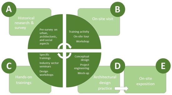 Working phases: (A) historical research and survey; (B) on-site visit; (C) hands-on training; (D) architectural design practice; (E) on-site exposition.
