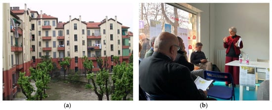 The on-site survey: (a) on-site tour in the San Siro neighborhood of public housing, and (b) workshop realized in the “Off Campus San Siro”.