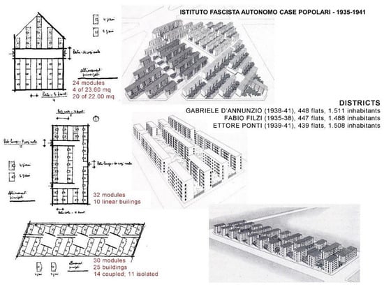 The buildings are physically damaged, mainly for the lack of economic investments, despite the extraordinary maintenance program realized by the “Contratti di Quartiere” (2003) that was devoted only to urgent security measures. In the last years, the sold-out of several dwellings addresses the financial difficulties []. Approximately 350 dwellings have an area lower than the dimensional threshold of 28.00 m2 defined by regional rules [], art. 9. Otherwise, about 700 homes need maintenance and regulatory adjustments. All these dwellings cannot be assigned for the uncomfortable and the unmaintained conditions. The project area is named “San Siro Milite Ignoto”. It is located in the western part of the neighborhood. It addresses the rationalistic principles of the architects Albini, Camus, Palanti, and Kovacs (1938–1941) []. The town plan is designed according to geometric rules (hence the “Quadrilatero”), in opposition to traditional urban plans based on diagonal roads and irregular lots. The buildings and the neighborhood are not listed. The complex insists on an area of 240,000 m2 for 480 homes. The lot is divided into four parts by two parallel streets (via Tracia and via Preneste). It consists of ten linear buildings oriented according to the heliothermic axis to optimize the exposure to the sun. Each building is a modular architecture composed of one, two, or three modules. This module is also on the basis of other public housings designed by Albini in Milan (e.g., Fabio Filzi neighborhood, 1935–1938, 447 flats; Ettore Ponti neighborhood, 1939–1941, 439 flats), as shown below (Figure 4).