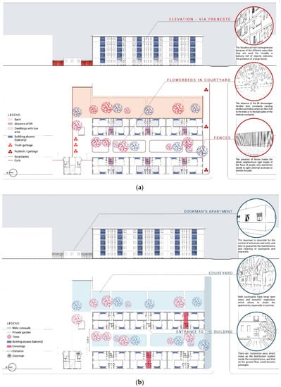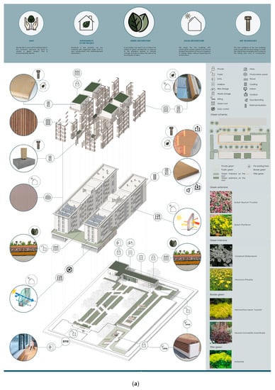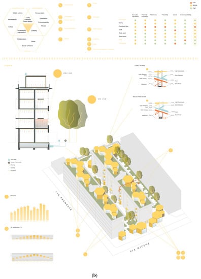 Another topic investigated concerns the green design. All the architectural projects reserve special attention to biophilic and bioclimatic concepts []. This organic approach starts from the characteristics of the site, combining human health, environmental sustainability, ecology, local microclimate, natural resources, green spaces, circular economy, and neighboring production of building materials. An important biophilic topic is related to the design of living landscapes and green spaces []. In all cases, the existing trees are maintained and recognized as a natural value for the district and a shadow system for outdoor spaces (e.g., Figure 9b, Figure 11b, and Figure 12). In many cases, new plants are inserted into the internal courts, using a broad range of greenery, hedges, and bushes for increasing biodiversity, improving air quality, suppressing dust particles, and reducing the urban heat island effect in the metropolitan area. Besides, the green courtyards are divided in the grassy courtyard, vegetable garden (to encourage the self-production of foods), exotic plants (to emphasize the multiculturalism), aromatic garden (to create sensory paths), playground, and green parking for strollers and bicycles (to satisfy the needs of the young families) (e.g., Figure 11b). For example, in the project “Greenin’ Micene-Preneste”, the grassy courtyards are partially opened to the citizens for reconnecting public and private spaces. Here, the living walls are used as fences and bollards (e.g., Figure 11b). It inserts also a green climbing façade on the internal courts: a light framework (composed of frames, trellises, and steel cables) is attached to the existing walls, for ensuring a minimal and reversible intervention that guarantees the preservation of the existing façades. Here, scented deciduous leaves trees (e.g., Jasminum, roses, ivy plants) enhance the local environment, creating an eye-catching design that involves the sense of smell, and increase the prestige of the buildings (Figure 11a). Environmental sustainability is optimized with thermal buffers, dust suppression, air purification, noise reduction, and high absorption properties. Furthermore, this green façade reduces the decay of the building surfaces (i.e., ultraviolet damage, fading, depolymerization), offsetting the maintenance costs. In the architectural project “Bee possible”, a vertical gardening technique produces foods for the inhabitants with urban farming in the internal courts. In several architectural projects, green roofs covered with a stratum of vegetation permits greenhouse effects mitigation, heat island effect reduction, system load reduction, footprint replacing, energy savings, air pollution, and stormwater deflection (e.g., Figure 9b and Figure 11b). In all the architectural projects, the bioclimatic concept at the building level refers to the internal layout that optimizes the natural energy sources (i.e., sunlight, wind) [] (e.g., Figure 9b). Thus, in all cases, well-oriented internal functions are studied (Figure 7, Figure 9b, and Figure 10).