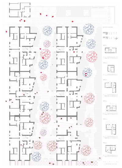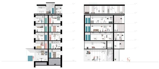 A third issue is the “housing cut”. In several cases, some rooms are merged vertically to create duplexes, studio apartments, and two-rooms and three-rooms apartments (Figure 10). Their flexibility is guaranteed by a structural frame system made by lamellar wood or recycled iron.