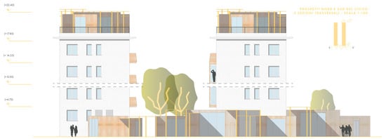 The attention of the architectural design project (phase D, Section 3.4 and Section 4.4) is focused on a housing development composed of two linear buildings, with a north-south orientation and five floors. Besides, here, the buildings follow the heliothermic axis for ensuring hygienic and thermal efficiency. Each building consists of three modules, corresponding to 120 flats with different sizes (one-room apartments, two-room apartments, and three-room apartments). The size of each dwelling is in the range 25–55 m2, and 40 flats have a too low size to be rented []. The construction techniques are composed mainly of vertical load-bearing partitions in solid brick masonry, horizontal slabs in brick-cement, perimeter curbs in reinforced concrete, and flat roofs (Figure 5).